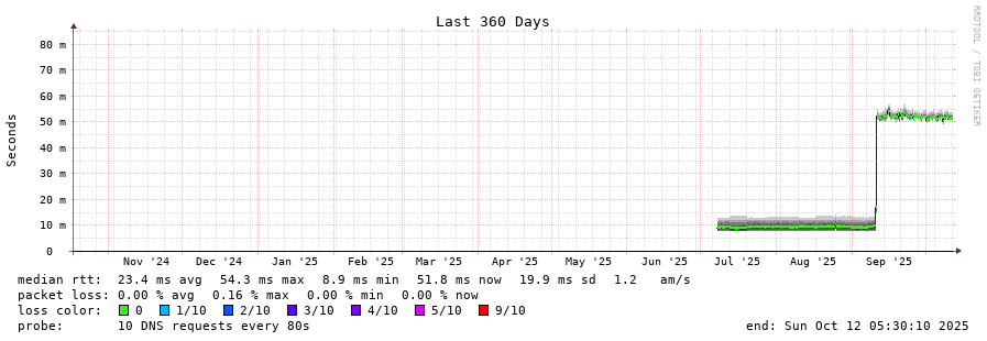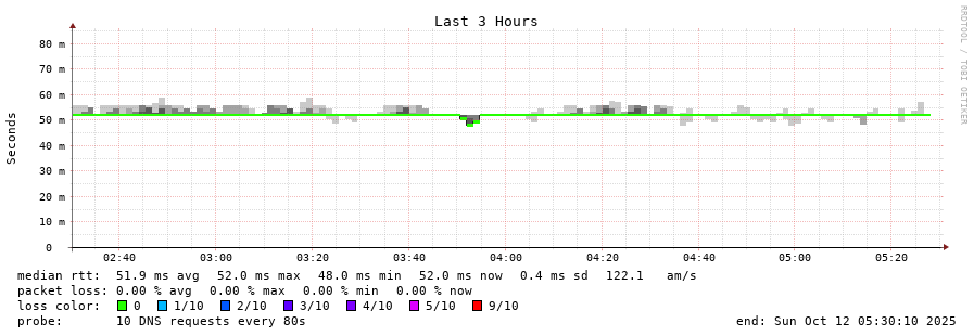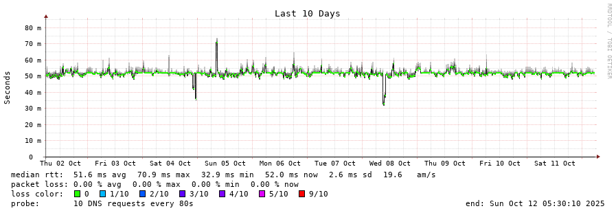 10 > l.root-servers.net (199.7.83.42) [AS7575/AS14259/AS16637/AS18451/AS19905/AS20144/AS27678/AS28513/AS38082/AS38456/AS38880/AS133296/AS262249] 51.846ms 51.825ms 51.780ms