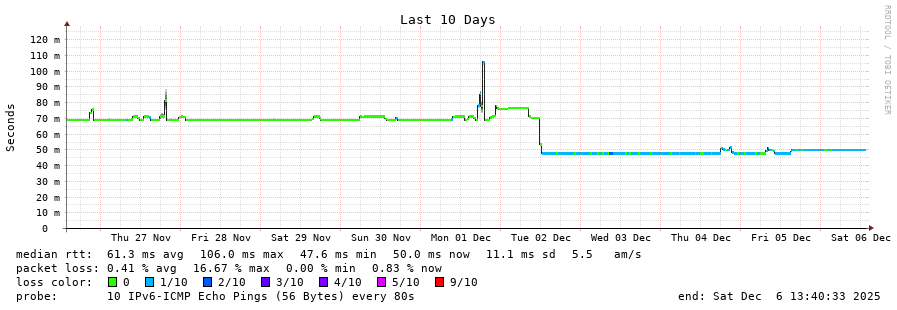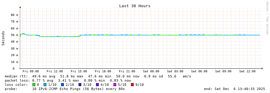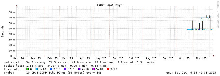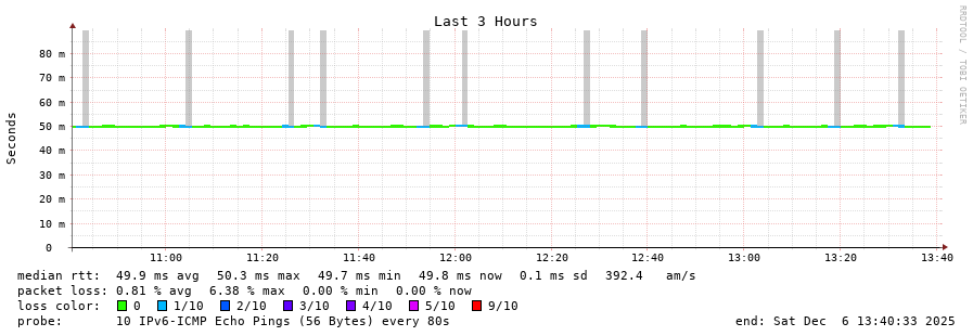 traceroute to 2001:4350:1:1::ff90 (2001:4350:1:1::ff90), 30 hops max, 80 byte packets - Generated at 2025-12-06 13:30:01